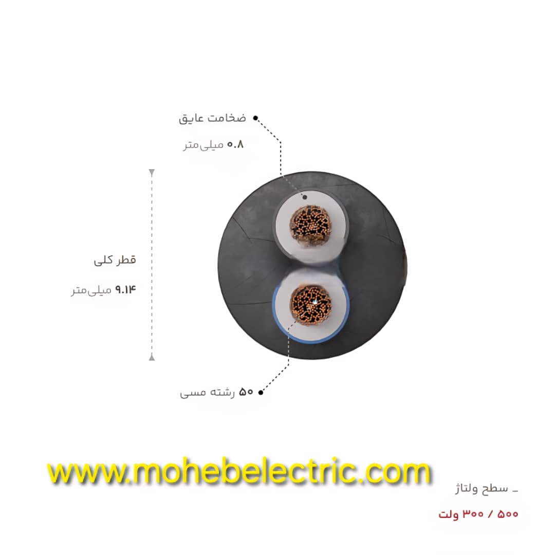 در داخل آن دو عدد سیم روکش دار رنگی مقطع 2.5میلی متر مربع قرار دارد که با پوشش PVC احاطه شده قطر آن 9.14 میلیمتر ،سطح ولتاژ 300/5000 ولت،توانایی آن در تحمل جریان اتصال کوتاه به میزان 278آمپر برای مدت یک ثانیه است دمای 160 درجه را تحمل میکند.